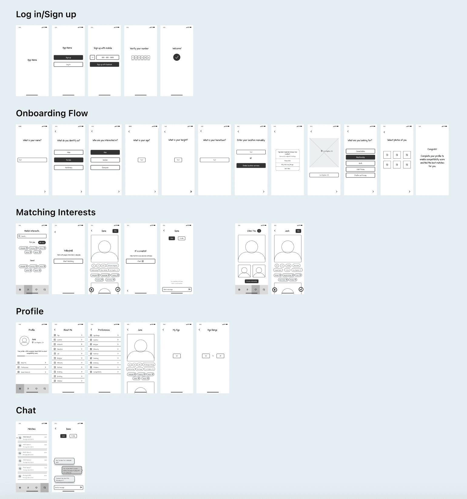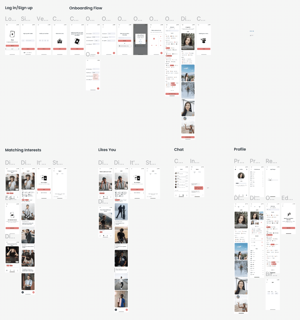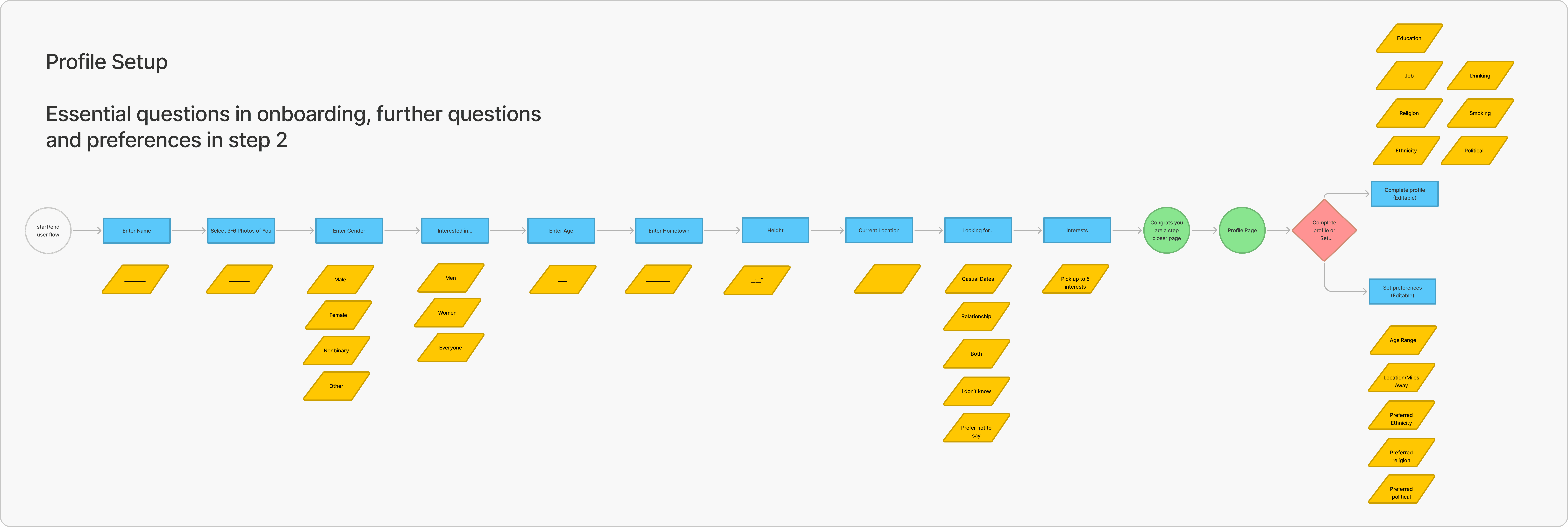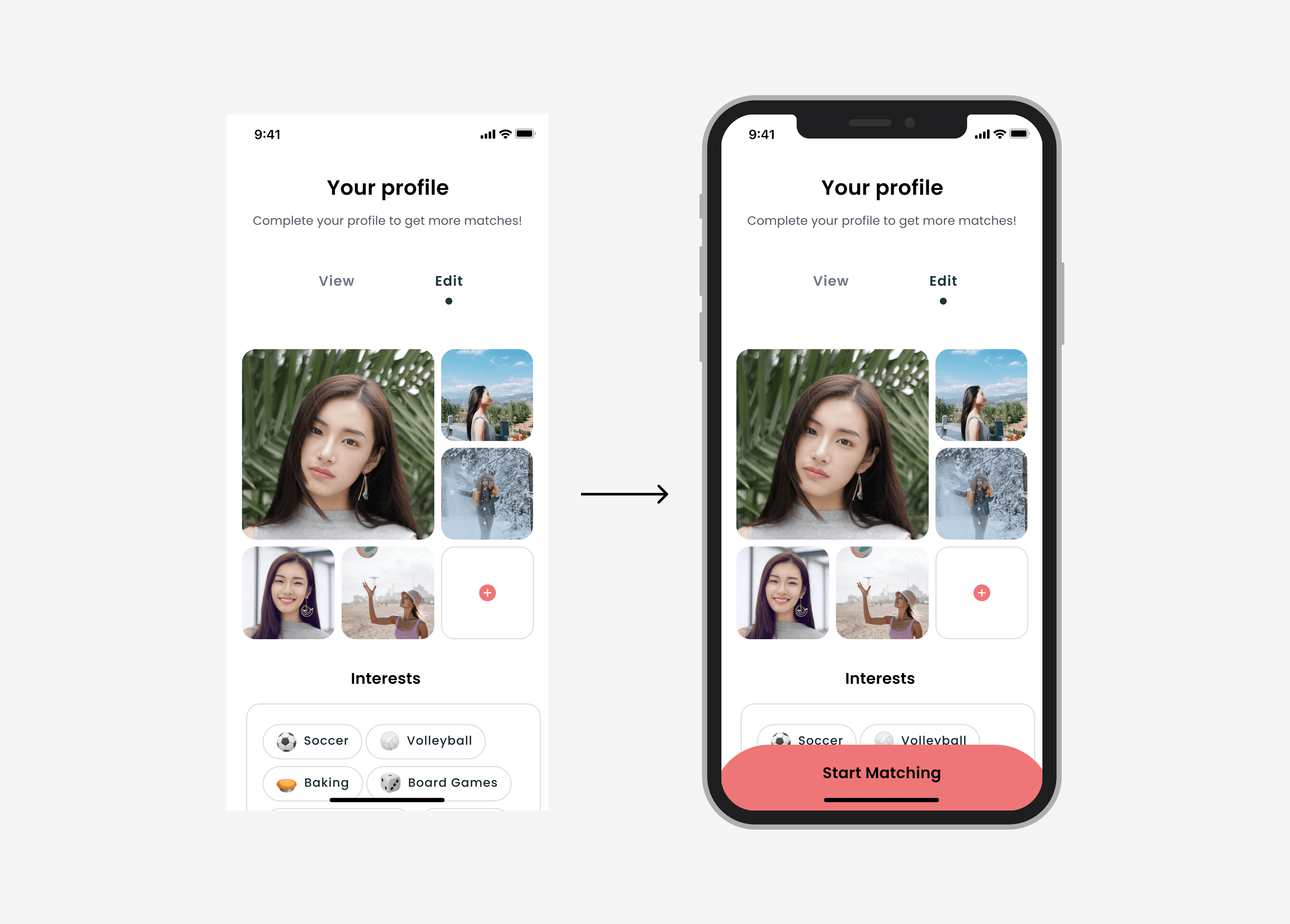 Then, I changed the preview profile at the end of the onboarding flow to have a fixed “Start Matching” button at the bottom. Users had to scroll to find that button at the bottom which confused them on what they had to do at that page. Since I just wanted to give the option for users to see what their profile would look like before they enter the app, I want them to know right away what they are able to do and how to enter the app.