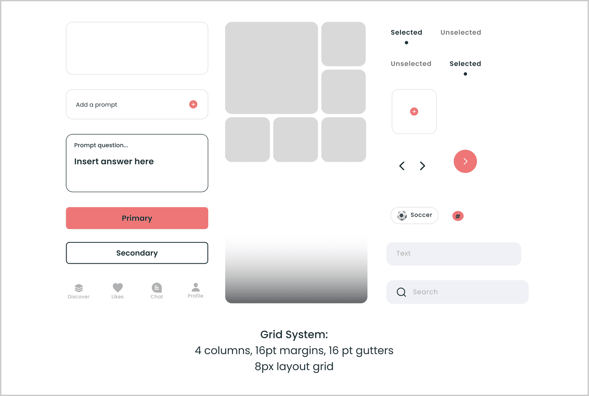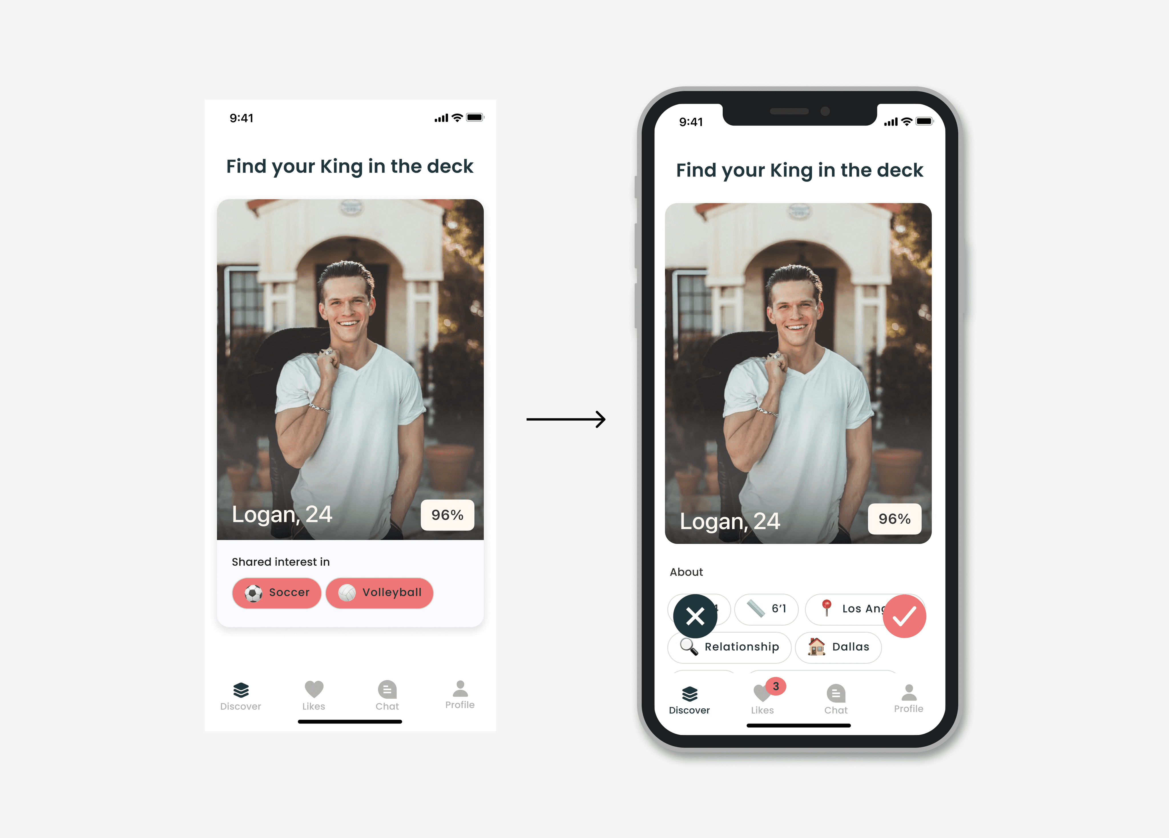 I changed the discover page to have one less step. Before, users were confused with the action they had to take when they landed on the Discover page. They didn’t know what to do with the card and they eventually found out that you have to click on it to go into the full profile of the prospect. I eliminated that step and put a frozen x and check on the bottom so all the user had to do was scroll and they could clearly see from the start that they had to choose.