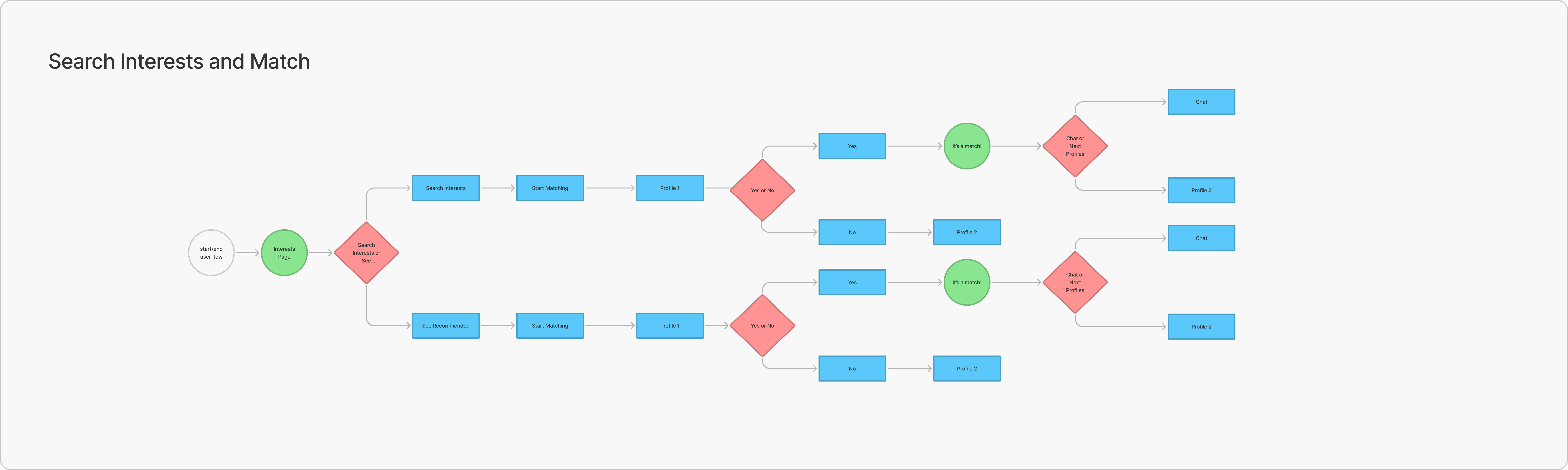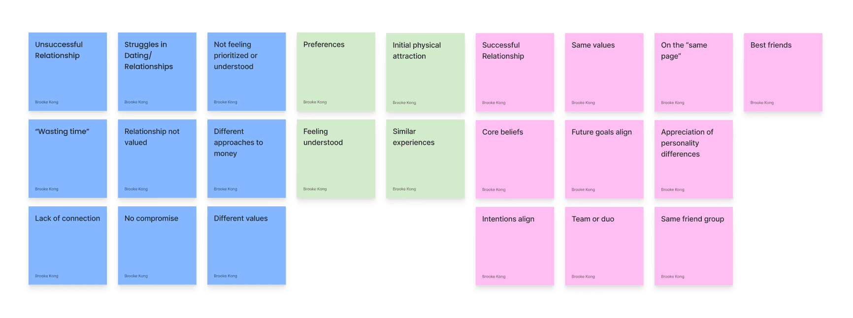 I took important points from my interviews and created an affinity map. I discovered that people tend to look for a romantic partner that is similar to them. The “opposites attract” phenomenon is not necessarily true. Several successful relationships stem from friendship because people who are friends usually share common ground and get along with ease.