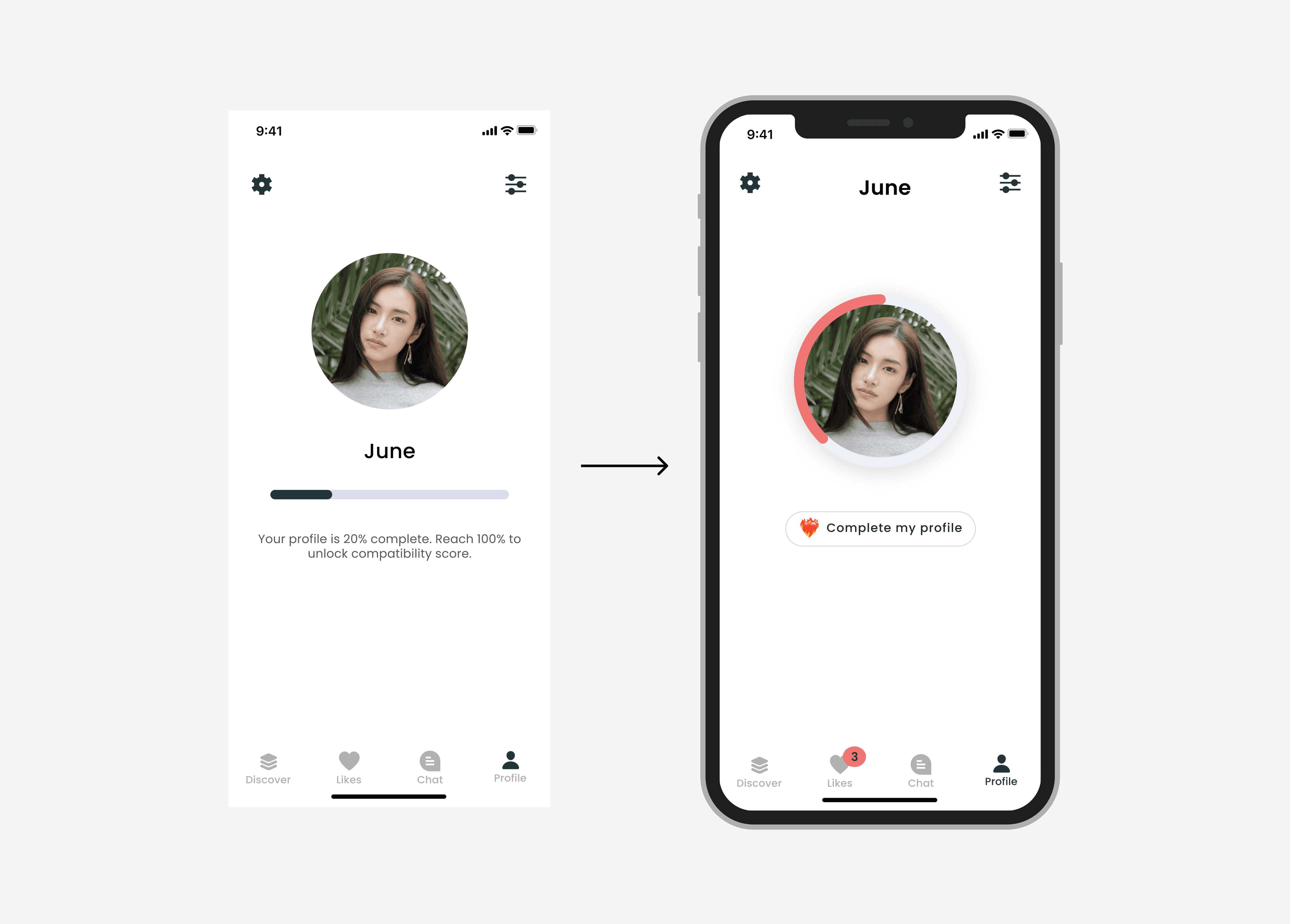 Next, I changed the profile page to have a call to action of “Complete my profile” because I found that users did not know that pressing the profile picture brought them to the profile. I also got rid of the “Your profile is 20% complete. Reach 100% to unlock compatibility score” because users would immediately try to follow the directions, but I just put that there so they could know that it was important to complete their profile. Now, it makes it clear for users to know what to do.