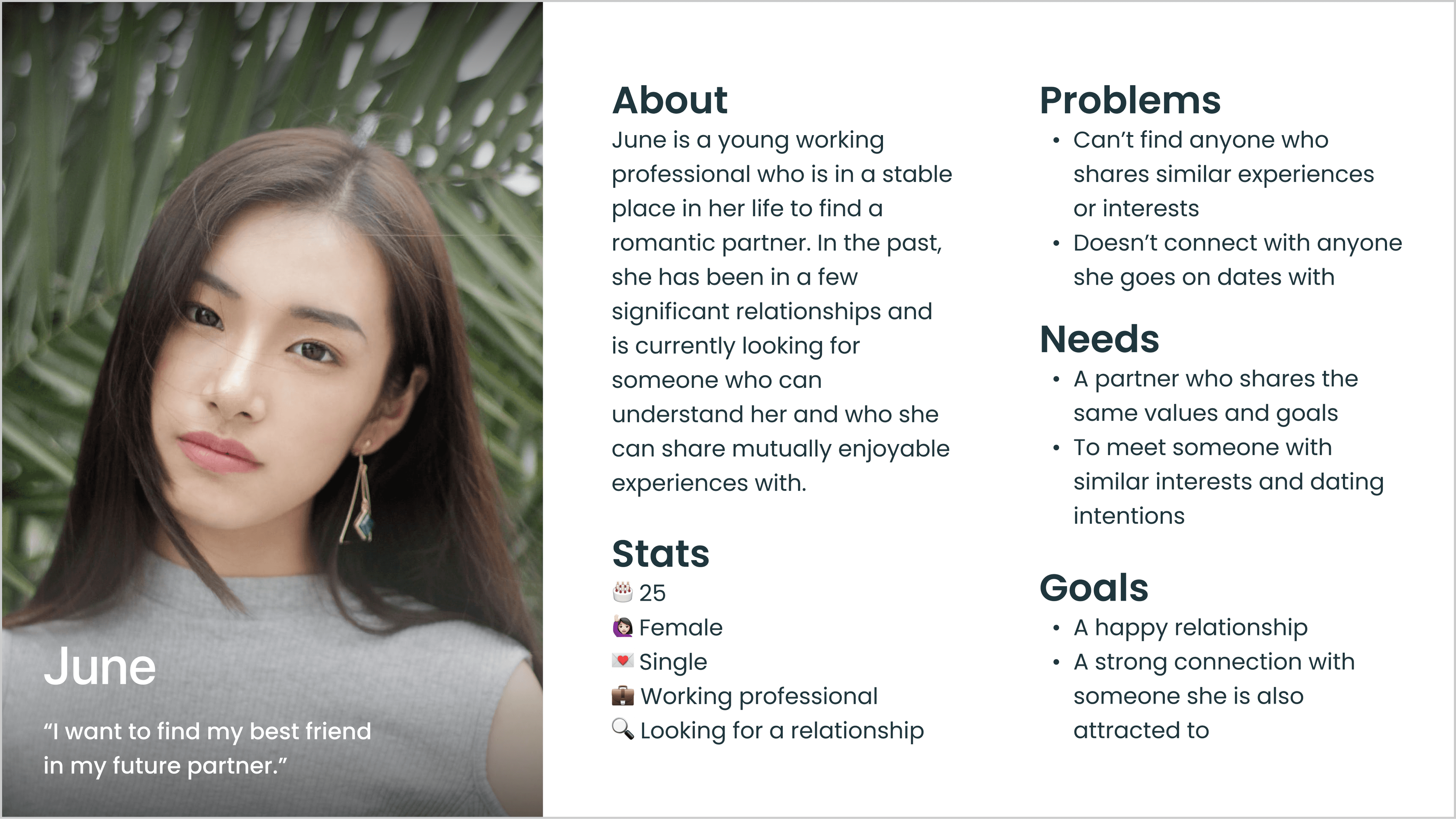 After interviewing 6 individuals with dating and relationship experience, I observed that people find it difficult to feel understood and connect to others when pursuing a romantic relationship. Also, people tend to look for those similar to themselves when seeking a romantic partner.