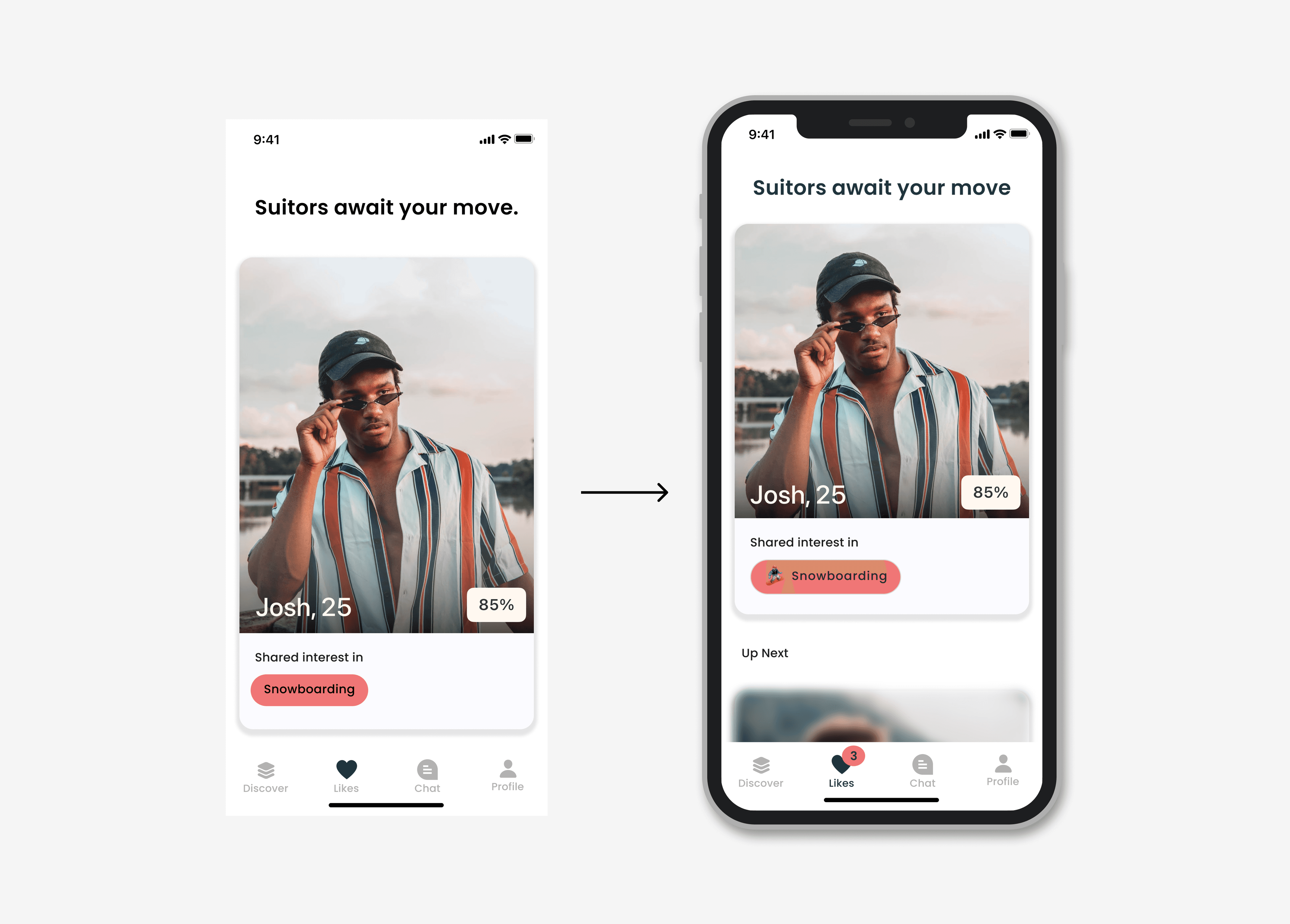 I also changed the Likes page to look different from the Discover. Originally, it was in the same format, and some people can be confused how it is different from the Discover page. I made it so that users are able to see a preview of all the people that liked them. This gives incentive to make a decision and keep matching if they can see the name and interest of the person that likes them. I made a scroll feature and made the cards smaller. I also added the amount of Likes the user has at the tab bar so they know upfront.