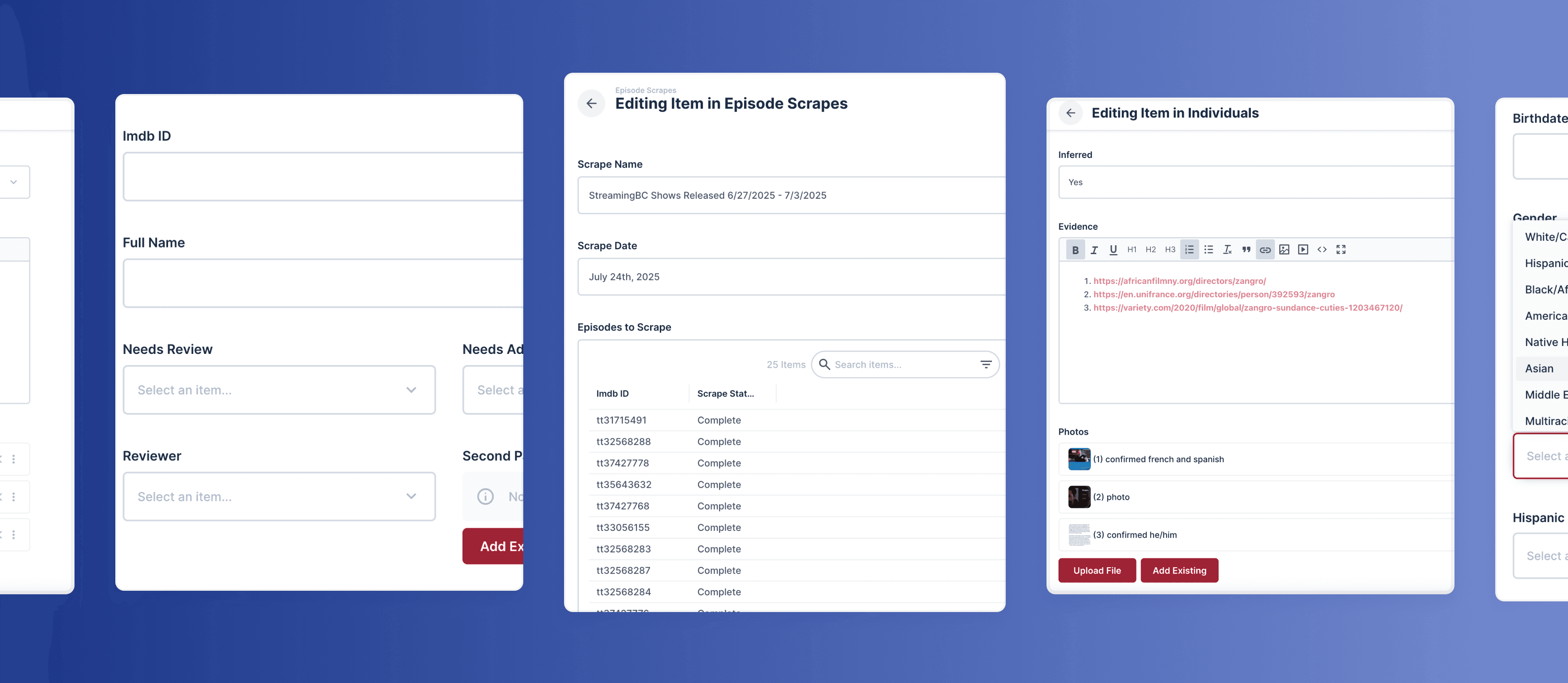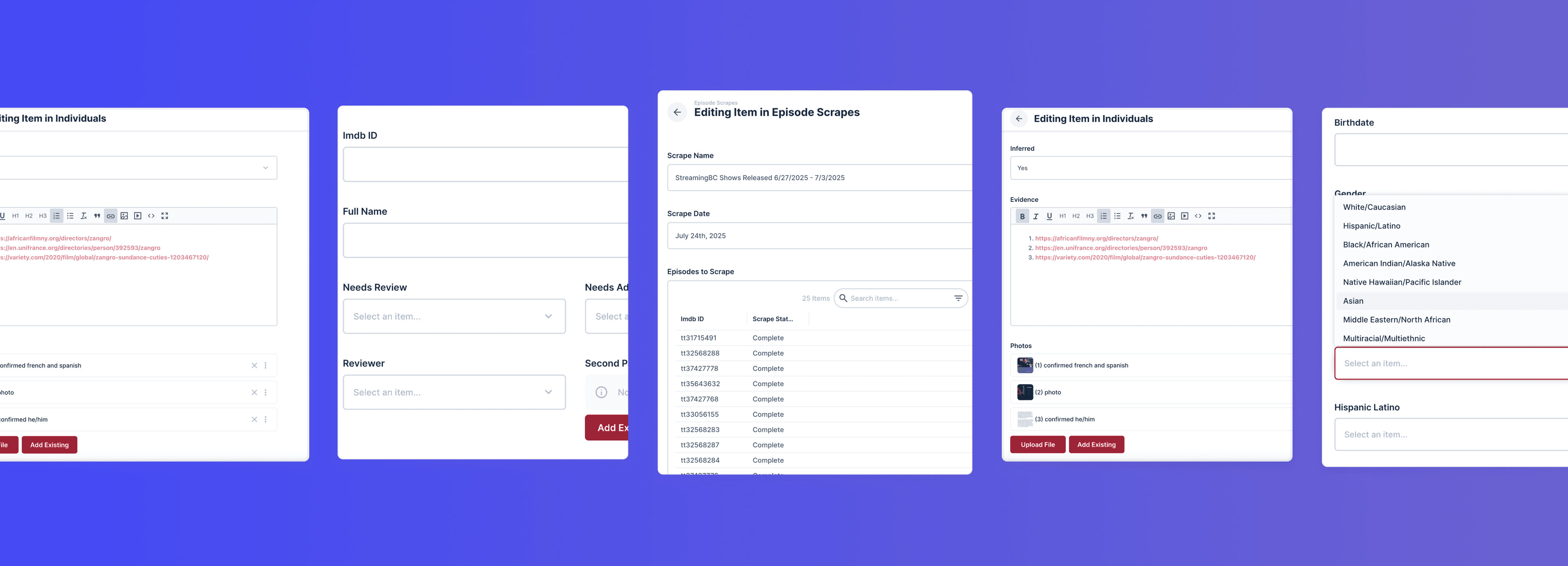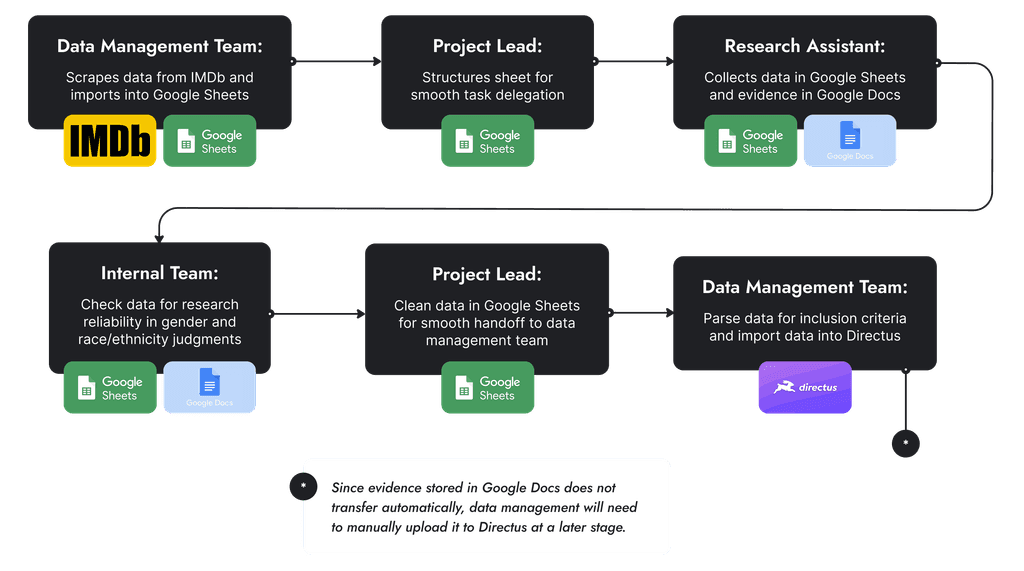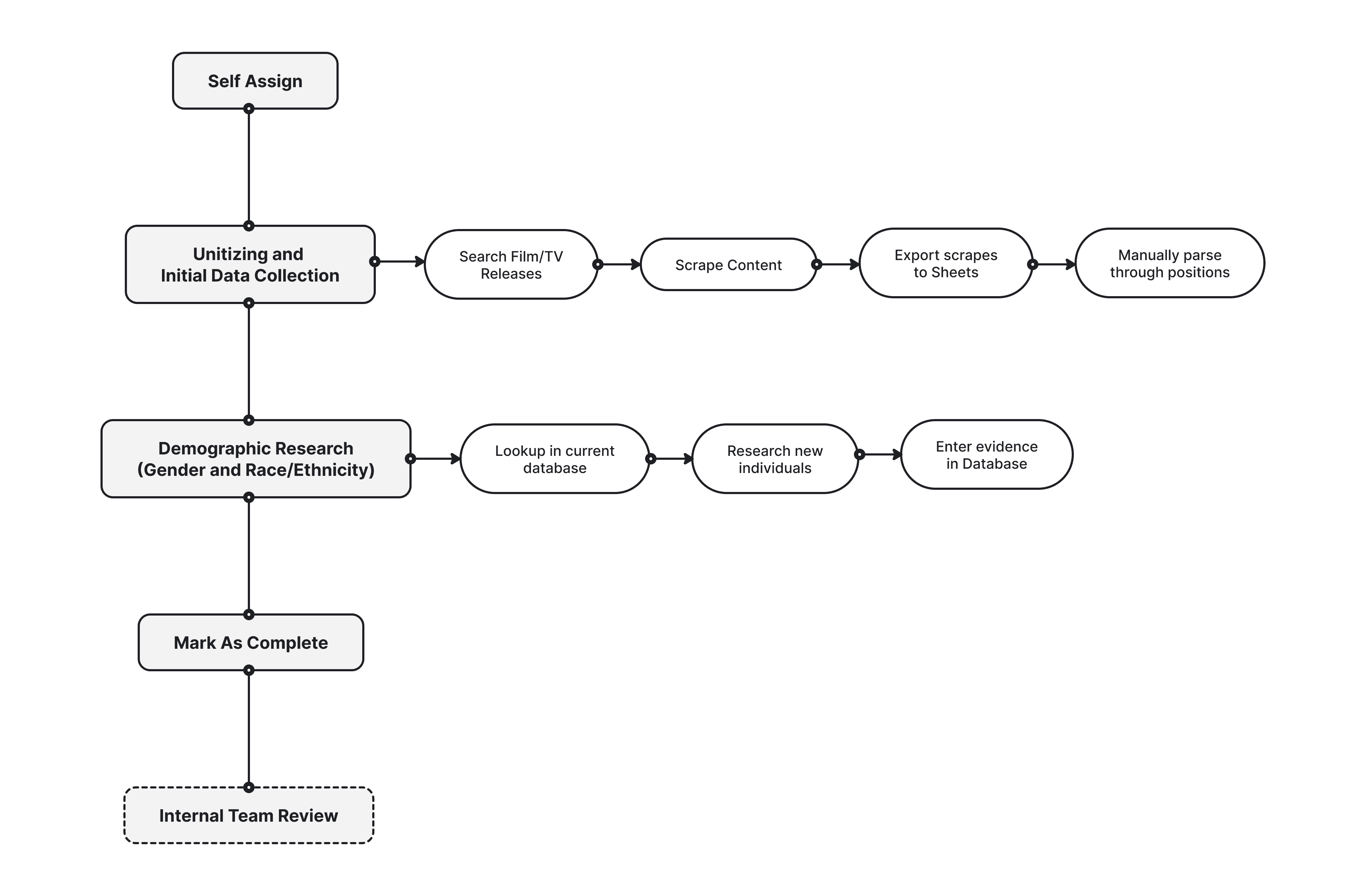 As part of the Annenberg Inclusion Initiative, the leading think tank studying diversity in entertainment, I led a redesign of our data collection workflow for capturing gender and race/ethnicity of individuals working in film and television. Our original process heavily relied on Google Sheets and Google Docs which created data inconsistencies and bottlenecks across teams.