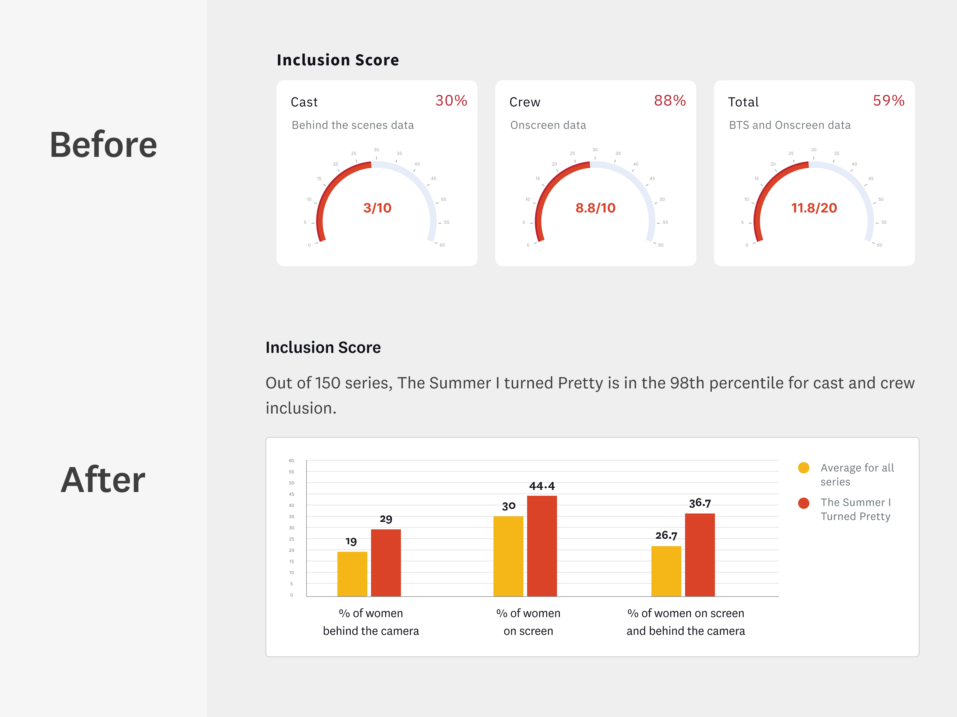 User interview quote: “Looking at the scores, I feel like they are failing”. I dove deeper into that statement and discovered that the appearance of a low score and the red color makes the gauge chart look like it’s communicating a negative message.