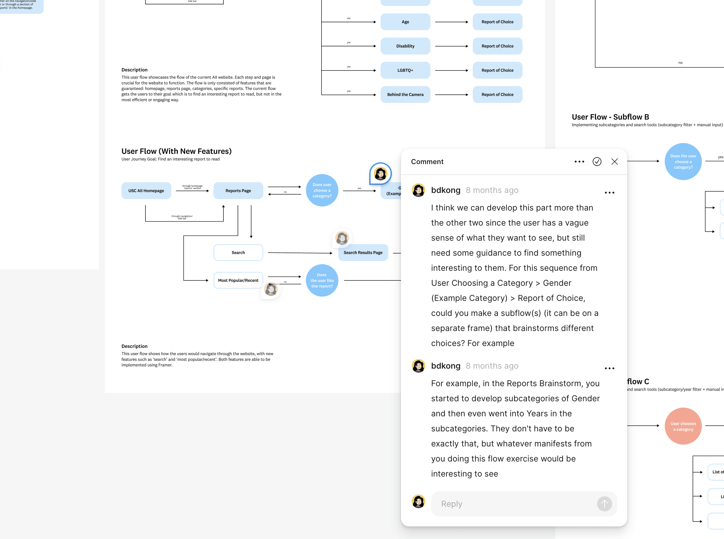 I led a user flow activity based on research goals. I reviewed these, giving feedback on decision points and encouraging deeper exploration of user behavior around report discovery (e.g., category selection, filters).